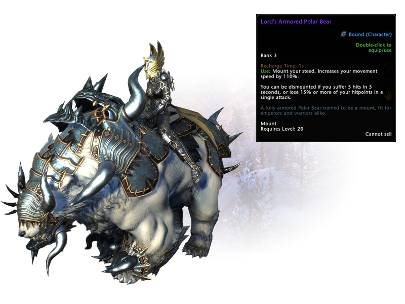 The Lord's Armored Polar Bear is one of the rarest mounts in Neverwinter. This majestic polar bear has carried emperors and warlords in its lifetime and now it shall carry you. Sporting armor that is both beautiful and terrifying, this mount has been known to stop entire armies in their tracks with its roar. This is a mount on which legends ride.