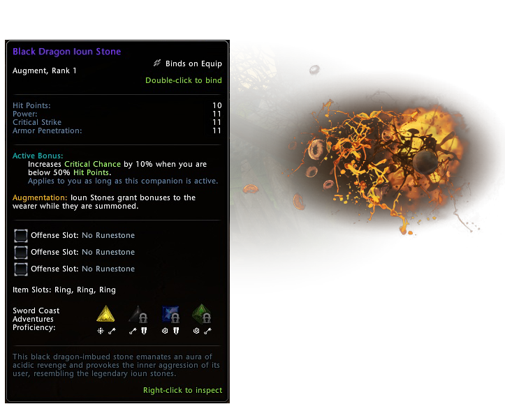 With its 3 Offense Rune Slots the epic Black Dragon Ioun Stone is one of the most sought-after companions in Neverwinter. Additionally, it will grant you a boost to your Critical Chance that might just give you the edge in your next PvE or PvP encounter.